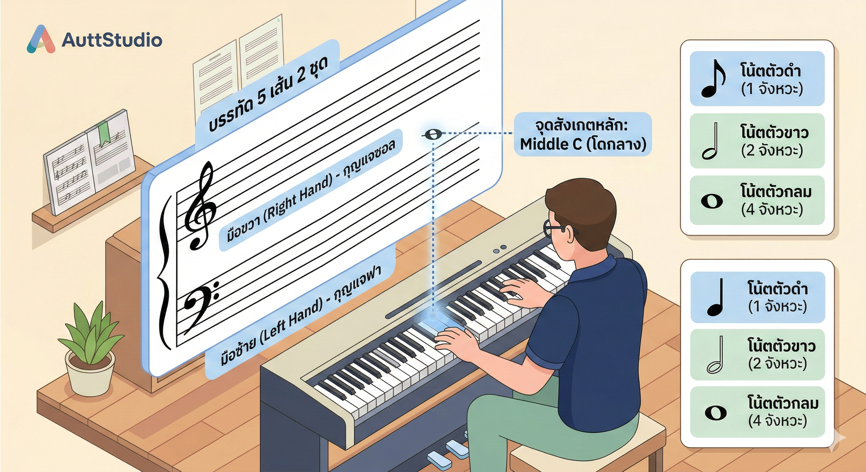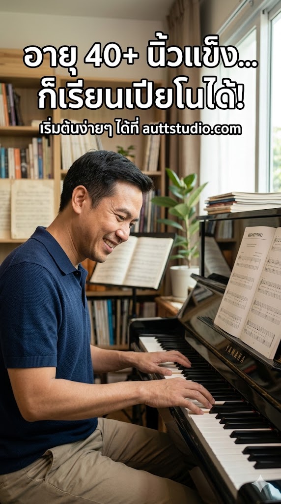 อยากเรียนเปียโนตอนอายุ 40+ แต่กังวลเรื่องนิ้วแข็งและอ่านโน้ตไม่เป็น? พบเทคนิคเริ่มต้นและทางลัดจาก AuttStudio ที่ช่วยให้ผู้ใหญ่เล่นเปียโนเป็นเพลงได้จริงในเวลาอันรวดเร็ว
