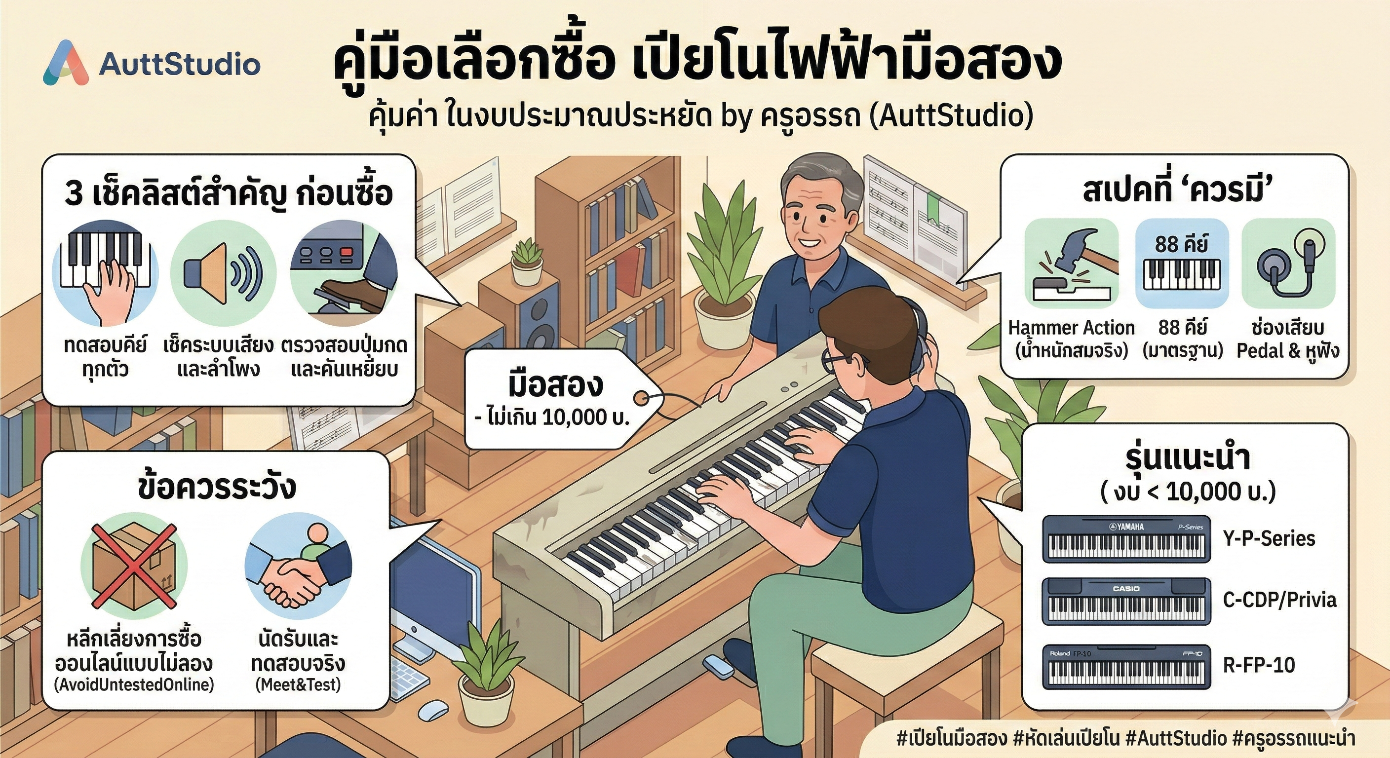 แนะนำเทคนิคการเลือกซื้อเปียโนไฟฟ้ามือสองในงบ 10,000 บาท เลือกรุ่นไหนดีให้เหมาะกับผู้เริ่มต้น พร้อมข้อควรระวังในการซื้อ